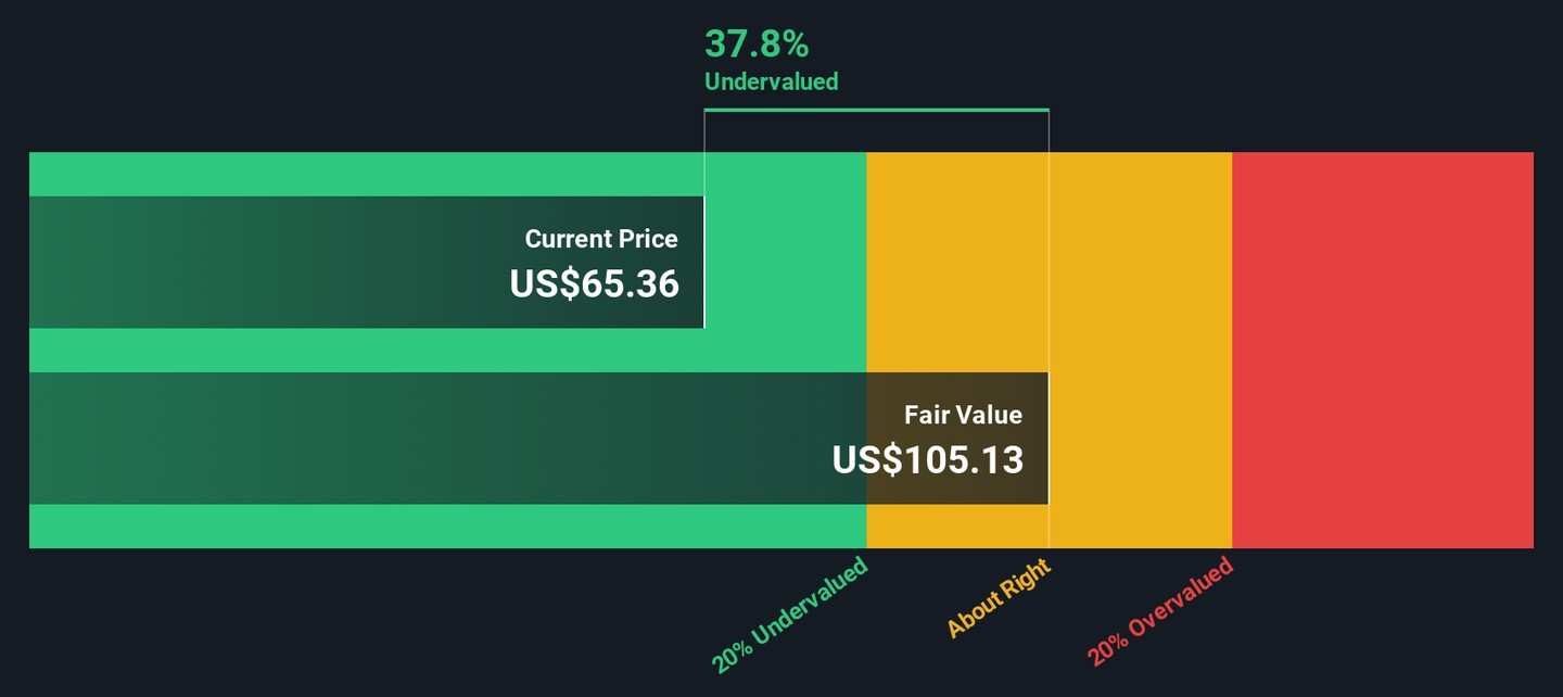 Looking at Stock Yards Bancorp through the lens of our DCF model, the results diverge from the P/E story. The SWS DCF model estimates a fair value of $105.13 per share, which is well above the current price. This suggests the stock may be meaningfully undervalued on a cash flow basis.