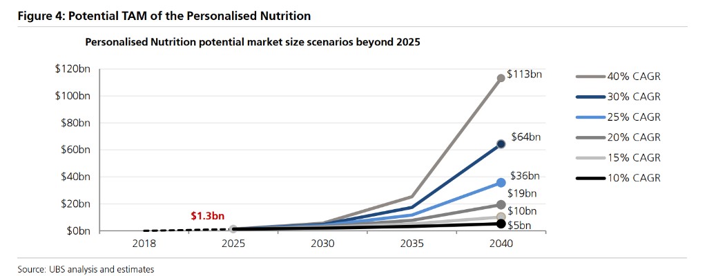 The UBS report points out that resource constraints and consumer demand for healthy and delicious options are driving the industry from standardized production to personalized nutrition solutions. The market is expected to reach a scale of USD 64 billion by 2040, but its market share is still less than 1%, indicating significant growth potential. This trend will reshape the food industry's value chain, forming a new cross-border ecosystem that includes biotechnology, food ingredients, and more, while traditional standardized food companies face the risk of being marginalized