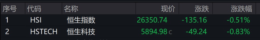 Hong Kong's Hang Seng Index opened down 0.51%, and the Hang Seng Tech Index fell 0.83%. Semiconductor and new energy vehicle concept stocks are correcting, while robotics and grid equipment concept stocks are strengthening.