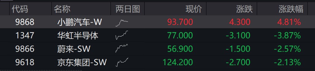 The Hang Seng Index opened down 0.51%, and the Hang Seng Tech Index fell 0.83%. Hua Hong Semiconductor dropped 3.9%, while Nio and JD Group fell over 2%. XPeng rose 4.8%.