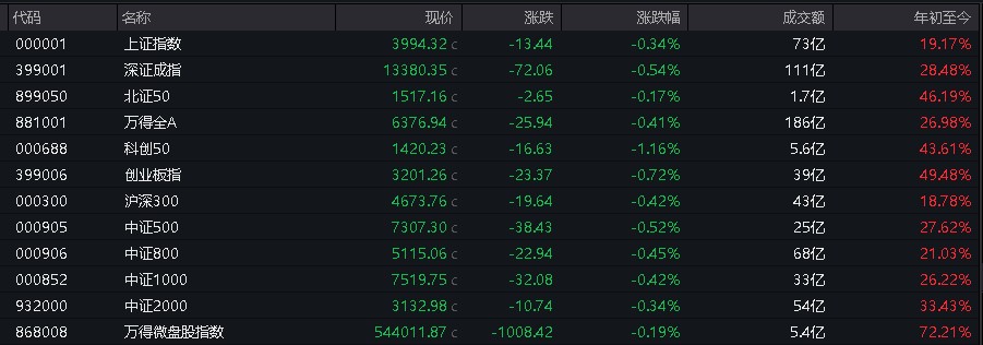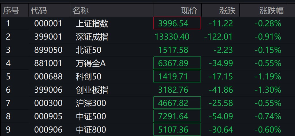 The ChiNext index fell over 1%, the Shanghai Composite Index dropped 0.19%, and the Shenzhen Component Index decreased 0.73%. CPO, AI chips, quantum technology, and PCB sectors saw significant declines, with over 3,100 stocks in the Shanghai, Shenzhen, and Beijing markets falling.