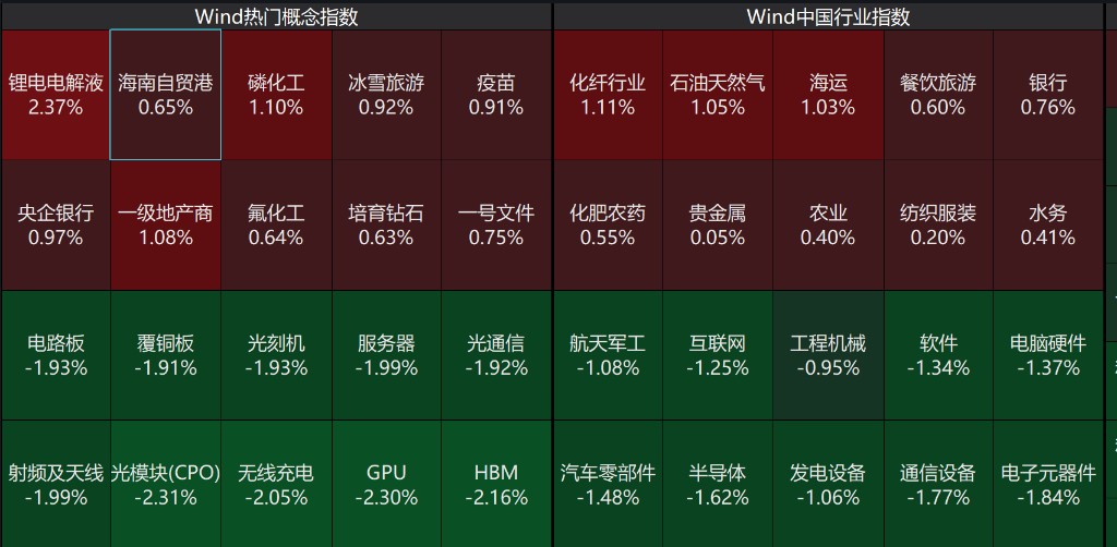 A-shares opened lower, with the ChiNext index down over 1%. The computing hardware industry chain is adjusting, with CPO and memory sectors leading the decline; electrical and grid concept stocks are also among the biggest losers. Lithium battery and Hainan Free Trade Zone themes are performing strongly against the trend.