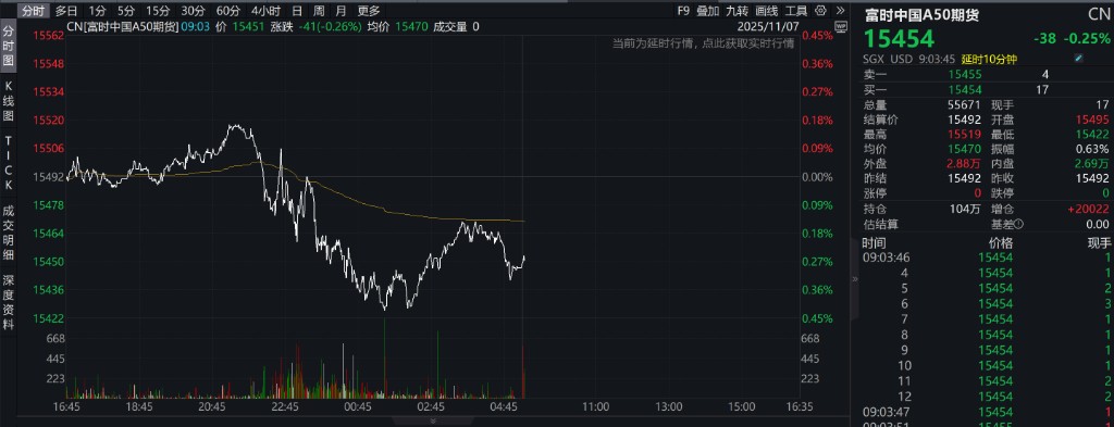The FTSE China A50 Index futures fell 0.31% at the beginning of trading, with the previous trading day's night session closing down 0.28%.