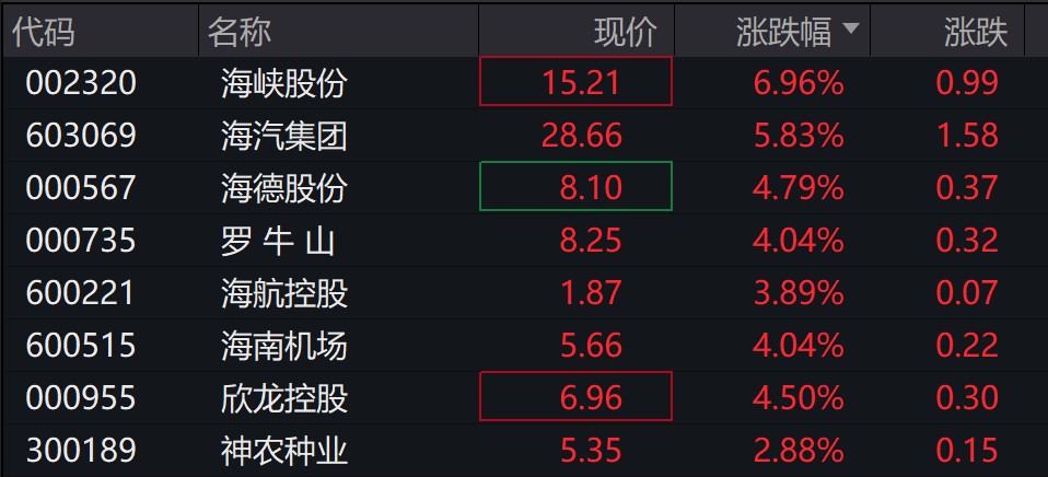 The A-share Hainan Free Trade Zone sector opened high, with HAIMA AUTO hitting the limit up, and Hainan Development, Kangzhi Pharmaceutical, Xinlong Holdings, Caesar Travel, and Haixia Co., Ltd. following suit.