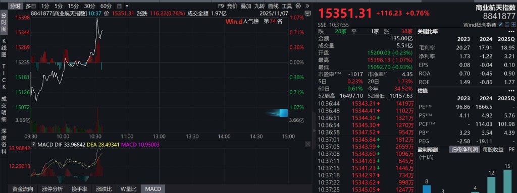 The A-share commercial aerospace sector saw a short-term surge, with Shanghai Huguang hitting the daily limit, Aerospace Zhizhuang up over 6%, and Shanghai Hanxun, Aerospace Power, and Aerospace Technology following suit.