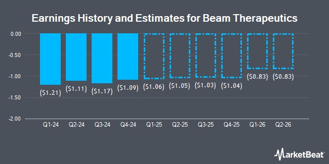 Beam Therapeutics Inc. (NASDAQ:BEAM - Free Report) - Equities research analysts at Cantor Fitzgerald reduced their FY2025 earnings per share (EPS) estimates for shares of Beam Therapeutics in a report issued on Wednesday, November 5th. Cantor Fitzgerald analyst E. Schmidt now anticipates that the company will post earnings of ($4.45) per share for the year, down from their previous estimate of ($4.42). Cantor Fitzgerald has a "Strong-Buy" rating on the stock. The consensus estimate for Beam Therapeutics' current full-year earnings is ($4.57) per share. Cantor Fitzgerald also issued estimates for Beam Therapeutics' FY2026 earnings at ($4.18) EPS.