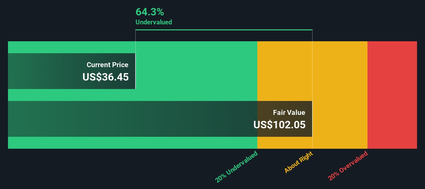 While analysts are wary of CVR Energy’s high share price, our SWS DCF model offers a different story. According to our DCF analysis, the stock is trading significantly below its fair value of $102.09. This suggests the market could be underestimating CVR Energy’s long-term cash flow potential, even though the current share price is higher than analyst targets. When two models paint very different pictures, which will turn out correct?