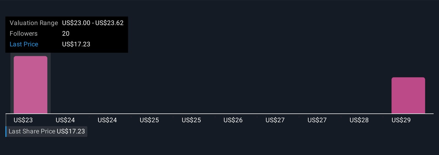 Three Simply Wall St Community fair value estimates for A10 Networks range from US$23.00 to US$29.20, reflecting a US$6,200 spread in perspectives. While some see a substantial gap to consensus targets, others highlight continued reliance on key customer accounts, which may influence how different investors assess risk and future returns.