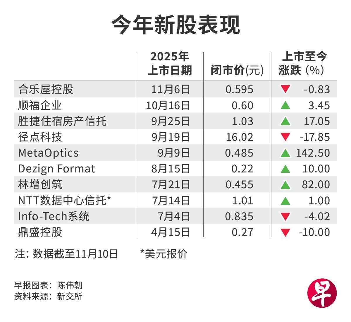 The performance of newly listed stocks in initial public offerings (IPOs) this year has far surpassed that of recent years, with MetaOptics standing out particularly. As of November 10 (the same date hereafter), its stock price has risen over 140% to HKD 0.485, up HKD 0.285 from the offering price of HKD 0.20. With the trend of declining interest rates and measures to boost the Singapore stock market, stock brokers and analysts are generally optimistic about the market outlook, although the doubling of stock prices in the short term may be limited to smaller market capitalization stocks with strong market demand.