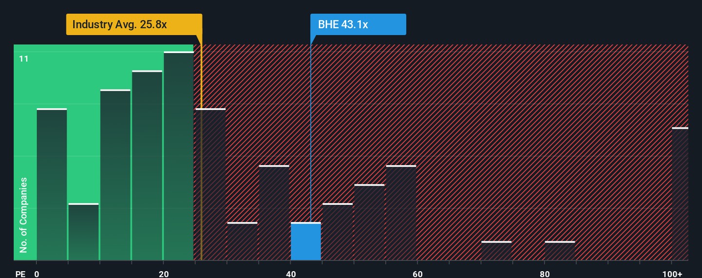 Benchmark Electronics, Inc. (NYSE:BHE) shares surged 25% this month, recovering from previous losses, but remain down 12% over the past year. The company's P/E ratio stands at 43.1x, significantly higher than the market average. Despite a disappointing 40% decline in EPS last year, analysts forecast a 45% growth in the coming year. This optimistic outlook supports the high P/E ratio, indicating investor confidence in future performance. However, there are two warning signs to consider before investing.