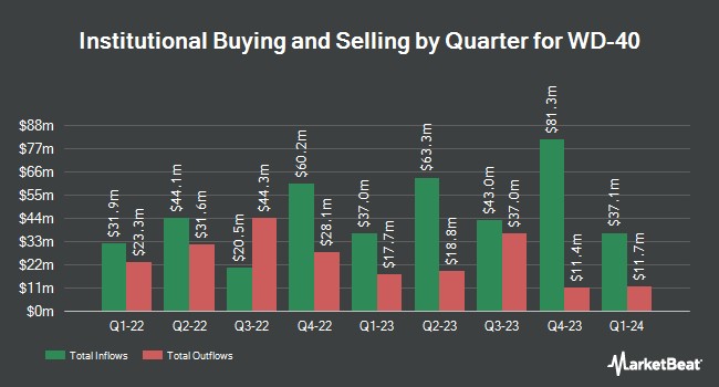 Several other institutional investors and hedge funds have also recently modified their holdings of the stock. Alliancebernstein L.P. raised its position in WD-40 by 1,767.7% in the 1st quarter. Alliancebernstein L.P. now owns 448,180 shares of the specialty chemicals company's stock valued at $109,356,000 after buying an additional 424,183 shares during the last quarter. Wellington Management Group LLP purchased a new stake in shares of WD-40 during the 1st quarter valued at $23,556,000. Invesco Ltd. raised its stake in shares of WD-40 by 122.0% during the 1st quarter. Invesco Ltd. now owns 162,181 shares of the specialty chemicals company's stock worth $39,572,000 after purchasing an additional 89,120 shares during the period. Jacobs Levy Equity Management Inc. purchased a new position in shares of WD-40 in the 1st quarter worth about $13,723,000. Finally, Geneva Capital Management LLC grew its position in WD-40 by 18.7% during the first quarter. Geneva Capital Management LLC now owns 248,197 shares of the specialty chemicals company's stock valued at $60,560,000 after buying an additional 39,137 shares during the period. 91.52% of the stock is owned by hedge funds and other institutional investors.