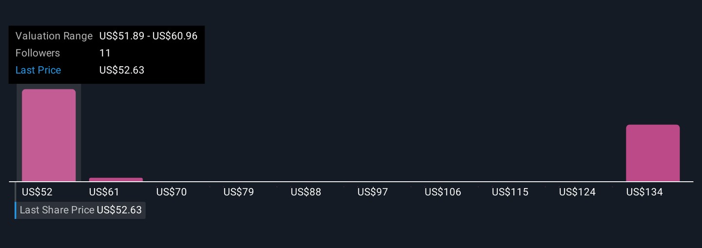 Four members of the Simply Wall St Community estimate Terex’s fair value between US$51.89 and US$91.44 per share. While community valuations span a wide range, many are watching the effect of tariff-related cost pressures on margins as a signpost for future performance, making it essential to consider how varied outlooks may affect your own view.