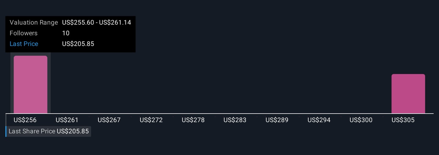 Simply Wall St Community members submitted two fair value estimates for Clean Harbors, ranging from US$255.60 to US$310.99. While opinions vary, the risk that evolving waste management technology could disrupt demand for core disposal services is a central issue and worth closer study. Explore the range of community viewpoints here.