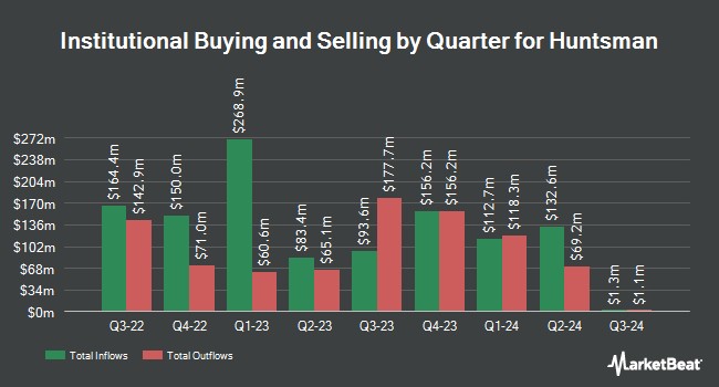 A number of other large investors have also bought and sold shares of HUN. Entropy Technologies LP raised its holdings in shares of Huntsman by 6.8% during the first quarter. Entropy Technologies LP now owns 19,434 shares of the basic materials company's stock valued at $307,000 after purchasing an additional 1,239 shares during the period. Gamco Investors INC. ET AL boosted its holdings in Huntsman by 1.2% in the first quarter. Gamco Investors INC. ET AL now owns 117,350 shares of the basic materials company's stock worth $1,853,000 after acquiring an additional 1,350 shares in the last quarter. Yousif Capital Management LLC grew its stake in Huntsman by 12.6% in the second quarter. Yousif Capital Management LLC now owns 12,390 shares of the basic materials company's stock valued at $129,000 after acquiring an additional 1,386 shares during the period. Quarry LP increased its holdings in shares of Huntsman by 40.3% during the first quarter. Quarry LP now owns 5,034 shares of the basic materials company's stock valued at $79,000 after acquiring an additional 1,445 shares in the last quarter. Finally, Kelleher Financial Advisors raised its position in shares of Huntsman by 5.7% during the second quarter. Kelleher Financial Advisors now owns 26,908 shares of the basic materials company's stock worth $280,000 after purchasing an additional 1,454 shares during the period. 84.81% of the stock is currently owned by institutional investors and hedge funds.