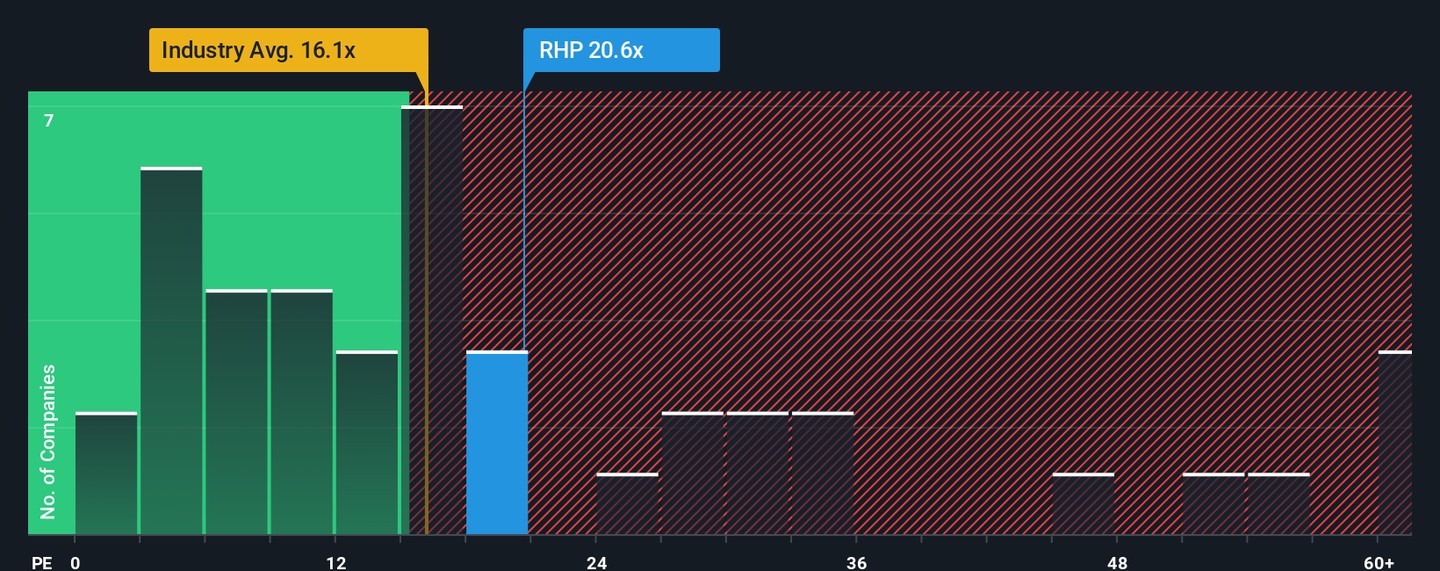 Taking a look at common market multiples, Ryman Hospitality Properties currently trades at a price-to-earnings ratio of 24.7x. This is higher than both its peer average of 22.5x and the broader global industry at 16x. While the fair ratio stands at 36.2x, the clear premium over peers indicates investors may be expecting more than the fundamentals suggest. Could this signal additional risk lurking beneath the surface, or is it an opportunity waiting to be unlocked?