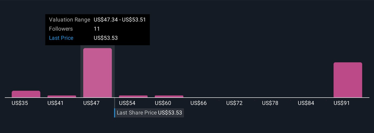 Eight fair value estimates from the Simply Wall St Community range from US$35 to US$96.70 per share. While consensus points to Millicom's growing earnings, sustained high capital expenditures still pose challenges for future margins and free cash flow.