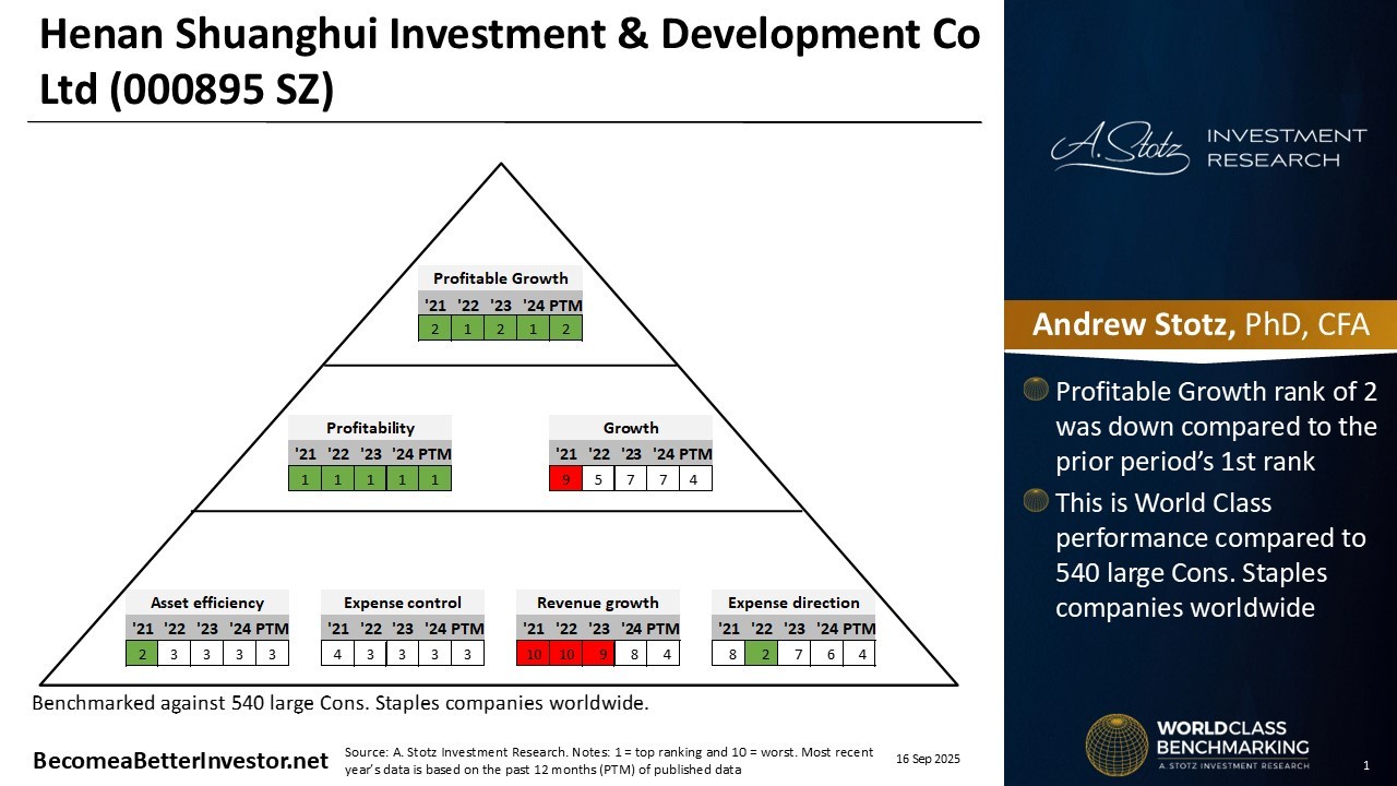 Henan Shuanghui Investment & Development, a subsidiary of WH Group, is a leading Chinese meat processing company. It ranks 2nd in Profitable Growth among 540 large Consumer Staples companies, with a profitability rank of 1, maintaining its previous period's rank. Its growth rank improved to 4 from 7, indicating above-average performance compared to peers. The company specializes in packaged and fresh pork products and operates globally.