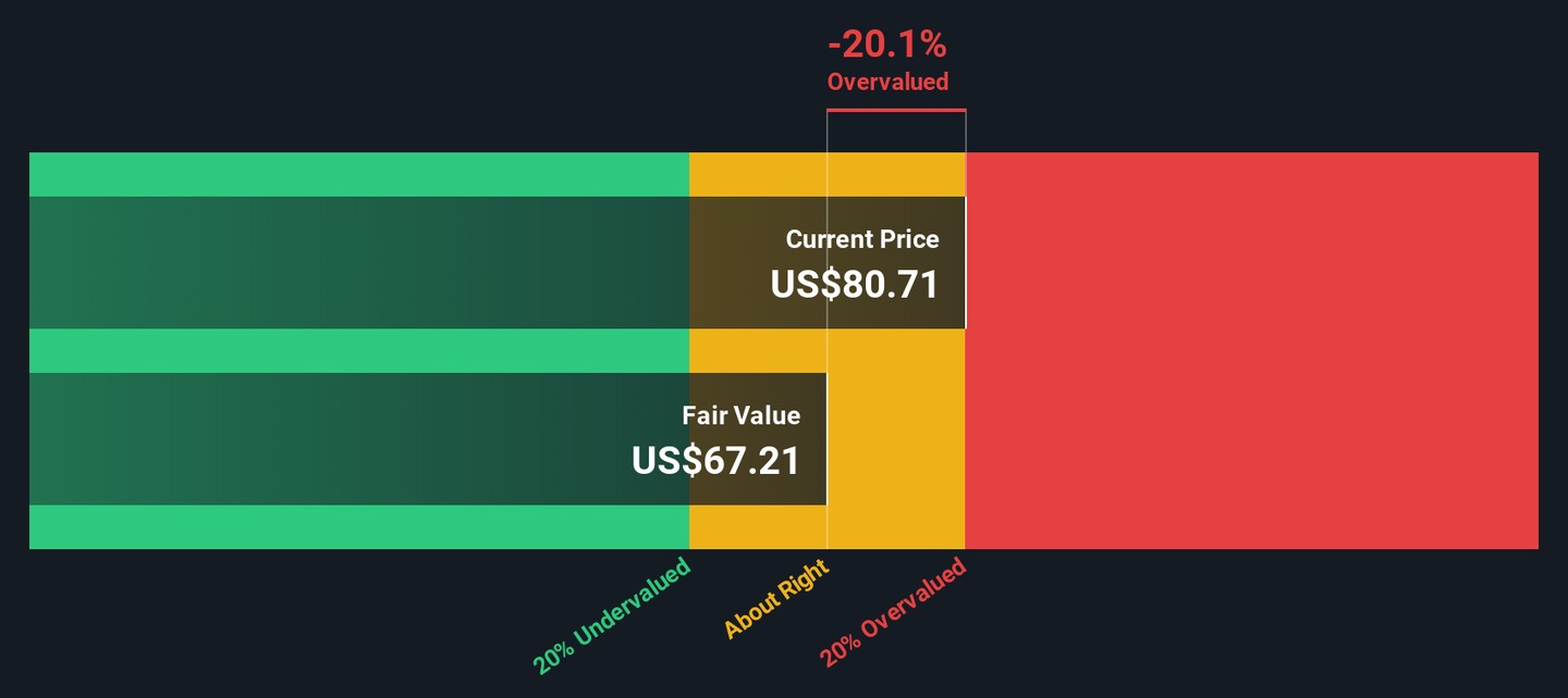 While the narrative and consensus suggest Brown & Brown is undervalued, our SWS DCF model tells a different story. According to this method, Brown & Brown’s shares actually trade well above the current estimate of fair value. This could indicate that the market is already factoring in more future growth than is realistic.