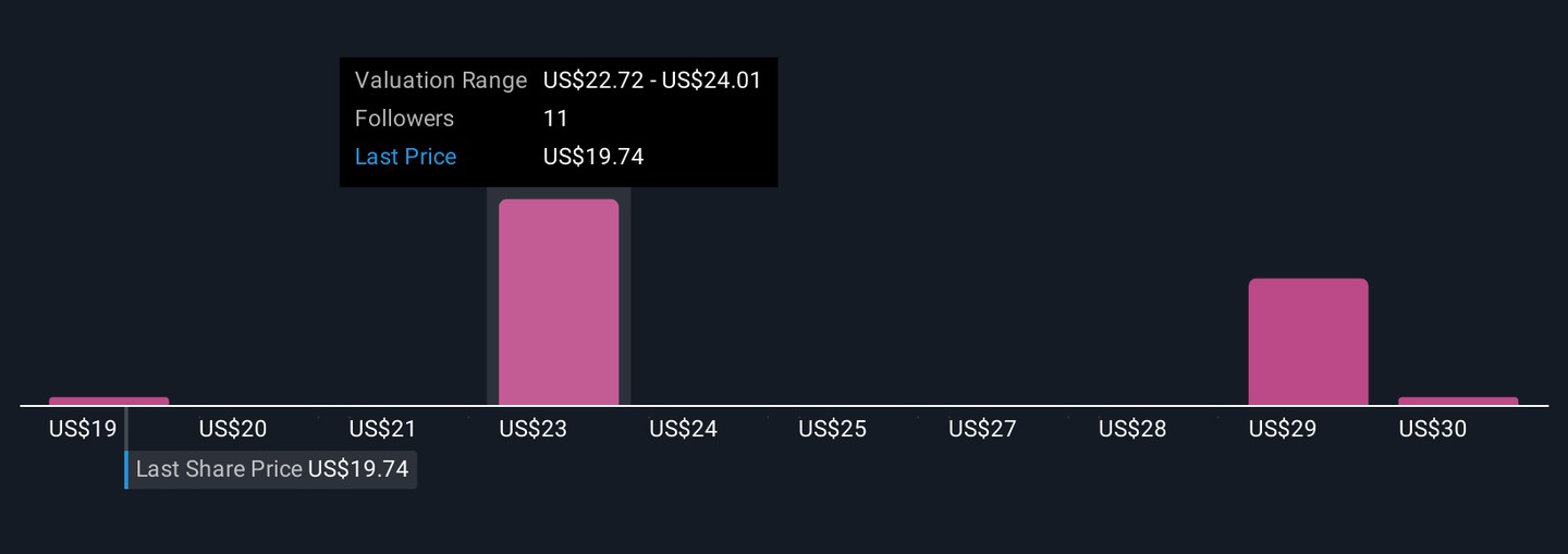 Four members of the Simply Wall St Community estimate fair value between US$18.86 and US$31.74 per share. Alongside this wide range, recent earnings suggest that differing views on profit margin trends could meaningfully impact future performance.