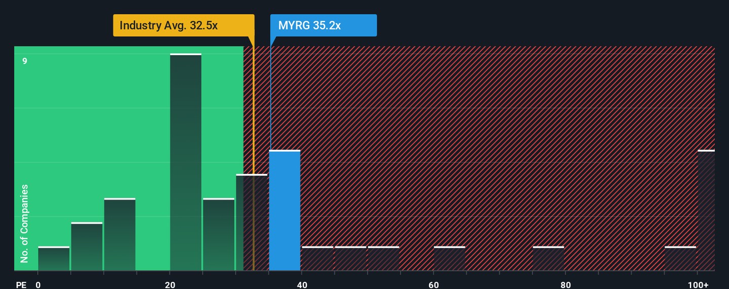 While the fair value narrative calls MYR Group slightly undervalued, a closer look at its price-to-earnings ratio tells a different story. At 35.2x, MYR Group trades much higher than its industry average of 32.5x, the peer average of 23.5x, and the fair ratio of 28.7x. This premium suggests that investors are betting on growth continuing without a pause. However, what could prompt a reset in expectations?