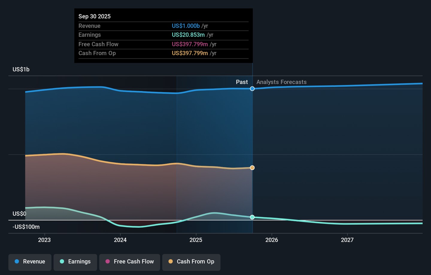Douglas Emmett is projected to reach $1.0 billion in revenue and $88.1 million in earnings by 2028. This outlook assumes a 1.1% annual revenue growth rate and a $66 million increase in earnings from current earnings of $22.1 million.