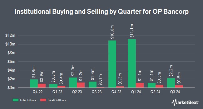 Several other hedge funds and other institutional investors also recently bought and sold shares of OPBK. Geode Capital Management LLC increased its stake in OP Bancorp by 118.3% in the second quarter. Geode Capital Management LLC now owns 273,701 shares of the company's stock valued at $3,556,000 after purchasing an additional 148,299 shares during the period. Connor Clark & Lunn Investment Management Ltd. grew its holdings in shares of OP Bancorp by 45.4% during the second quarter. Connor Clark & Lunn Investment Management Ltd. now owns 129,342 shares of the company's stock worth $1,680,000 after buying an additional 40,414 shares during the last quarter. Acadian Asset Management LLC grew its holdings in shares of OP Bancorp by 15.2% during the first quarter. Acadian Asset Management LLC now owns 271,112 shares of the company's stock worth $3,254,000 after buying an additional 35,708 shares during the last quarter. Jane Street Group LLC increased its position in OP Bancorp by 124.6% in the 1st quarter. Jane Street Group LLC now owns 45,394 shares of the company's stock valued at $546,000 after acquiring an additional 25,181 shares during the period. Finally, Goldman Sachs Group Inc. increased its position in OP Bancorp by 45.9% in the 1st quarter. Goldman Sachs Group Inc. now owns 62,824 shares of the company's stock valued at $755,000 after acquiring an additional 19,758 shares during the period. 53.63% of the stock is owned by hedge funds and other institutional investors.