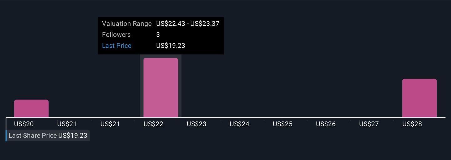 Simply Wall St Community members have submitted fair value estimates for Simmons First National ranging from US$17.02 to US$29.22, based on three separate forecasts. With ongoing concerns about commercial real estate exposure, you can see that market participants hold sharply different views on future performance, explore these varied perspectives for a deeper understanding.