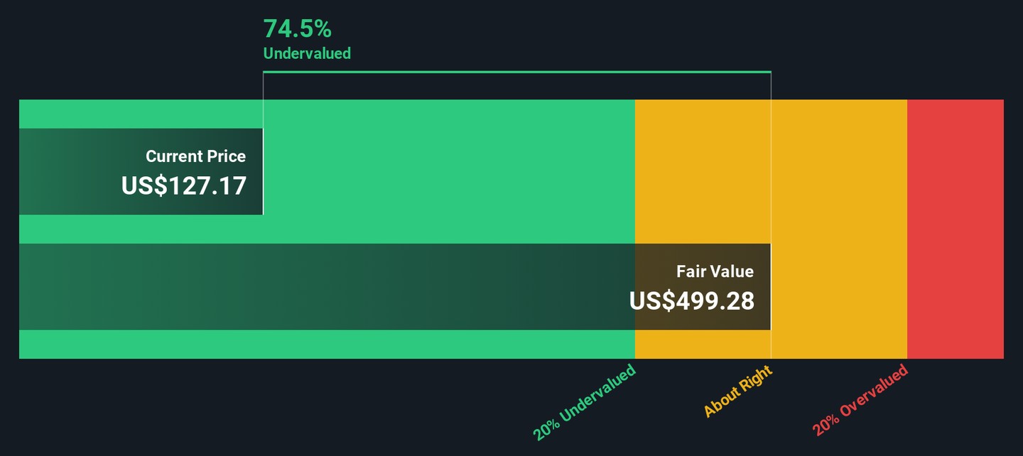 Based on this model, the estimated intrinsic value per share comes out to $497.98. That suggests National HealthCare trades at a 74.7% discount to its DCF-derived fair value. In other words, this indicates the stock may be significantly undervalued relative to its long-term cash flow prospects.