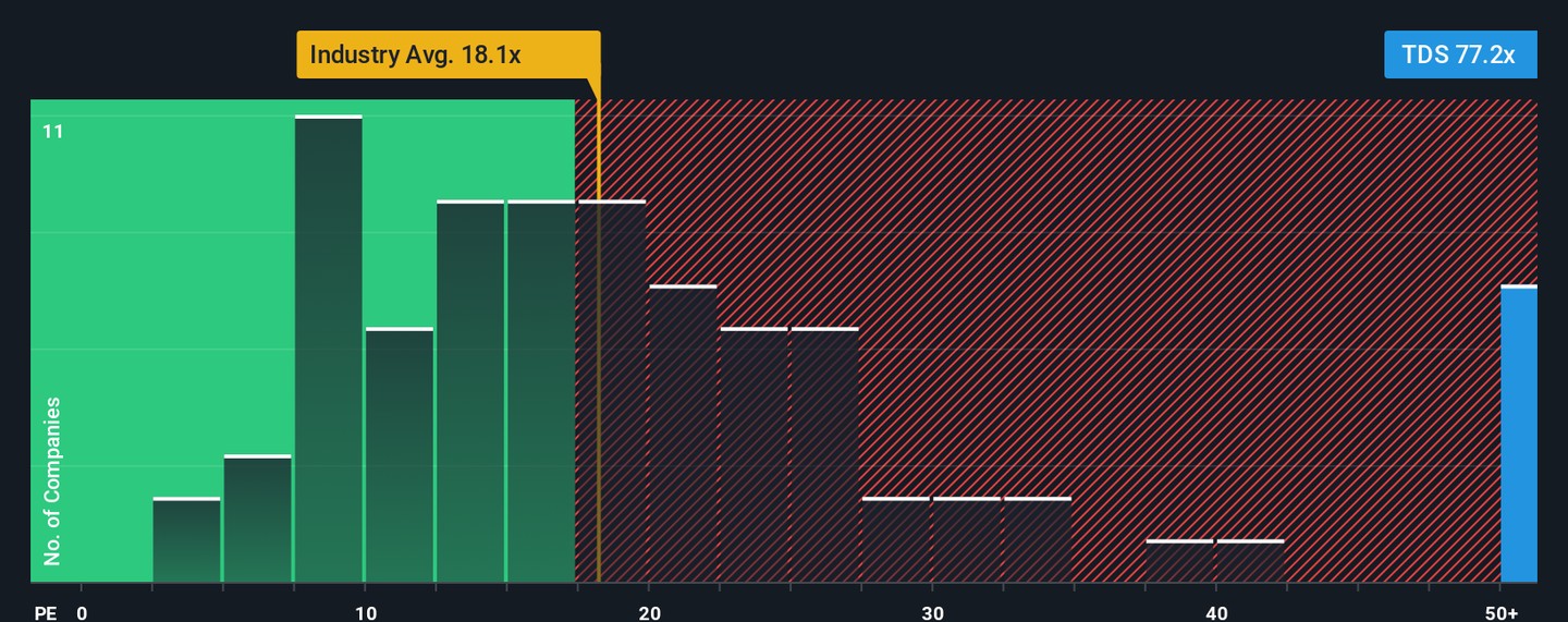 Looking at price-to-earnings ratios, TDS appears expensive, trading far above both its industry peers and even the fair ratio our research suggests the market could move toward. This wide gap means investors face more valuation risk than opportunity if current expectations change. Could the market be overestimating TDS's growth?