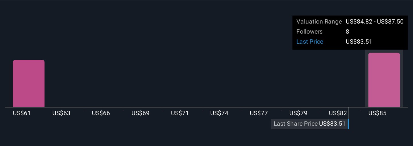 What’s more, Narratives update automatically when important news, earnings, or company developments come out, keeping your assessments current. For MSC Industrial Direct, for example, one investor might believe that strong in-plant program expansion and technology upgrades will drive significant growth, supporting a higher fair value of $105.00, while another might worry about demand softness and margin pressures, setting their fair value at just $81.00. Narratives help you make more dynamic, personalized investment decisions, always grounded in real numbers and up-to-date data.