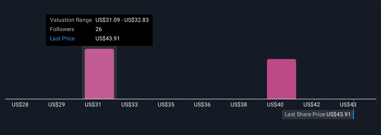 Five private investors in the Simply Wall St Community estimate Napco’s fair value from US$27.61 to US$47.67 per share. While some expect recurring revenue advances to drive resilience, others remain wary that margin pressures and core hardware risks could temper the overall upside, making it vital to consider multiple outlooks.