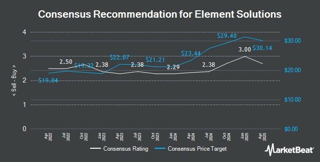 Shares of NYSE ESI traded down $0.11 during mid-day trading on Thursday, reaching $24.06. The company had a trading volume of 680,066 shares, compared to its average volume of 2,455,084. Element Solutions has a 52-week low of $16.77 and a 52-week high of $29.78. The stock has a market cap of $5.82 billion, a P/E ratio of 24.36, a PEG ratio of 1.74 and a beta of 1.36. The company has a current ratio of 4.05, a quick ratio of 3.30 and a debt-to-equity ratio of 0.61. The firm has a 50 day simple moving average of $26.10 and a two-hundred day simple moving average of $24.33.