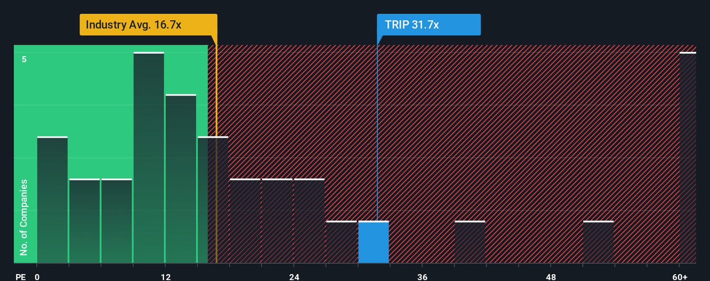 While the fair value estimate suggests Tripadvisor is undervalued, looking at its price-to-earnings ratio paints a more cautious picture. The company trades at 21.5 times earnings, which is higher than industry peers at 16.8x and above the fair ratio of 20.5x. This gap implies investors are already paying a premium, so is there truly as much upside as the narrative implies, or does it increase valuation risk?