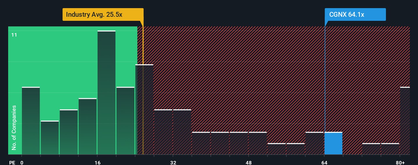 Looking at Cognex through the lens of its current price-to-earnings ratio, the stock trades at 56.1 times earnings. This is much higher than both its peer average of 39.4 and the fair ratio of 34.8. This wide premium signals increased valuation risk if future growth falls short. Is the market paying too much up front, or is a rerating in store if performance matches up?
