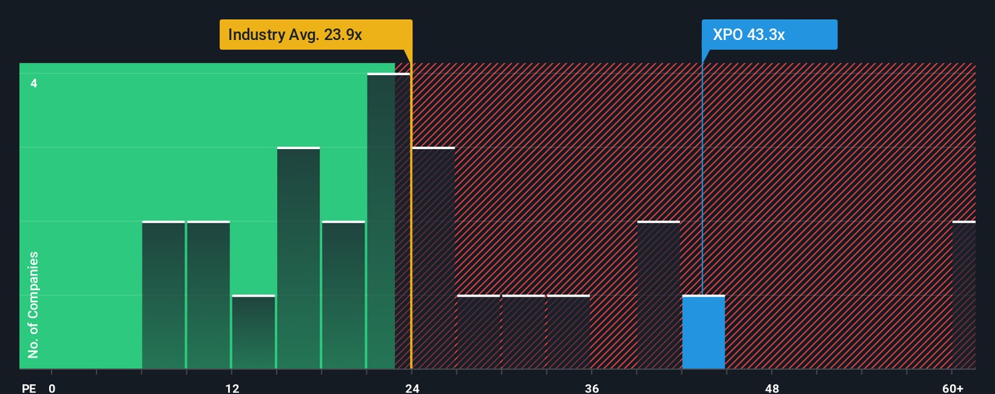 Looking from a different angle, XPO currently trades at a price-to-earnings ratio of 46.9x. That is not just higher than the US Transportation industry average of 25x, but also well above its peers at 28.8x, and over double our calculated fair ratio of 19.2x. This large premium raises the question: are investors taking on extra risk by paying too much for future growth that might not fully materialize?