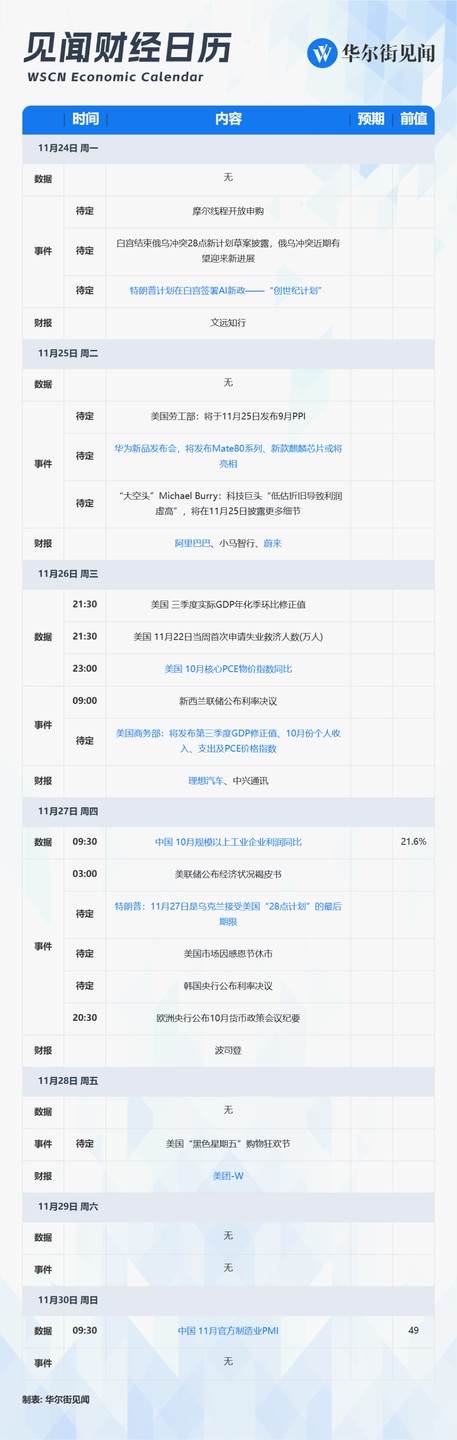 Key Focus Next Week: Earnings reports from Alibaba, Meituan, Li Auto, Nio, as well as Pony.ai and WeRide. The latest economic data from China and the U.S., and the Federal Reserve will release its latest economic conditions Beige Book. Huawei's new product launch event is expected to unveil the Mate80 series. Trump plans to sign a new AI policy - the "Genesis Plan" - at the White House. Trump stated that November 27 is the deadline for Ukraine to accept the U.S. "28-point plan."