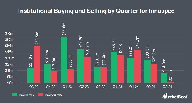 Several other institutional investors have also bought and sold shares of IOSP. Franklin Resources Inc. grew its holdings in Innospec by 2.5% during the 2nd quarter. Franklin Resources Inc. now owns 27,672 shares of the specialty chemicals company's stock worth $2,327,000 after acquiring an additional 673 shares during the last quarter. Legal & General Group Plc boosted its position in shares of Innospec by 1.4% during the second quarter. Legal & General Group Plc now owns 69,673 shares of the specialty chemicals company's stock worth $5,859,000 after purchasing an additional 943 shares in the last quarter. JPMorgan Chase & Co. lifted its holdings in Innospec by 17.6% during the second quarter. JPMorgan Chase & Co. now owns 321,164 shares of the specialty chemicals company's stock worth $27,007,000 after acquiring an additional 48,152 shares in the last quarter. Entropy Technologies LP bought a new stake in Innospec during the 2nd quarter worth approximately $873,000. Finally, Dynamic Technology Lab Private Ltd increased its position in shares of Innospec by 65.0% during the second quarter. Dynamic Technology Lab Private Ltd now owns 16,801 shares of the specialty chemicals company's stock worth $1,413,000 after acquiring an additional 6,616 shares in the last quarter. Institutional investors and hedge funds own 96.64% of the company's stock.