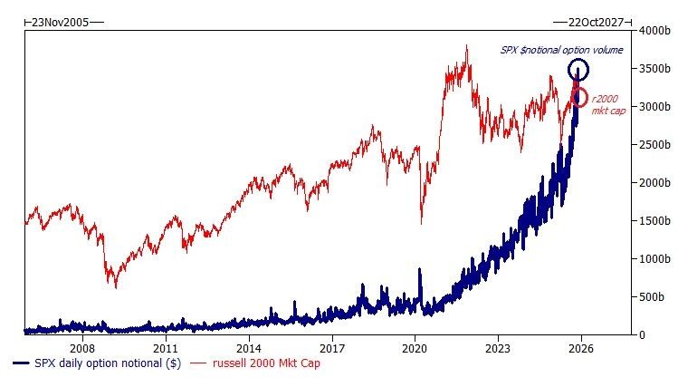It is worth noting that the average daily trading volume of S&P 500 options has now reached $3.5 trillion, setting a historical high, officially surpassing the total market capitalization of the Russell 2000 index (the market capitalization of 2,000 companies compared to the nominal daily trading volume of S&P 500 options).