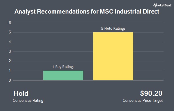 MSC Industrial Direct Company, Inc. (NYSE:MSM - Get Free Report) has been assigned a consensus rating of "Hold" from the seven research firms that are presently covering the firm, MarketBeat Ratings reports. Five analysts have rated the stock with a hold rating, one has issued a buy rating and one has given a strong buy rating to the company. The average 12 month target price among brokers that have covered the stock in the last year is $91.50.