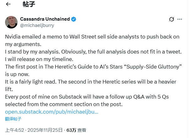 It should be noted that although Burry was previously misreported by the media to hold a "nearly $1 billion" short position on NVIDIA (which actually had a nominal value of only $9.2 million and had partially been closed), this has not changed his determination to be bearish on the macro logic of AI.