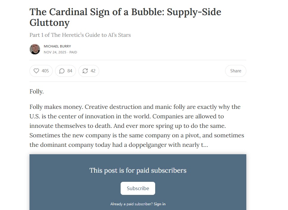 This intense analysis was published in Burry's newly launched paid column "Cassandra Unchained," with an annual fee of $379. "The Major Signs of a Bubble: Supply-Side Gluttony" is the first article in the column.