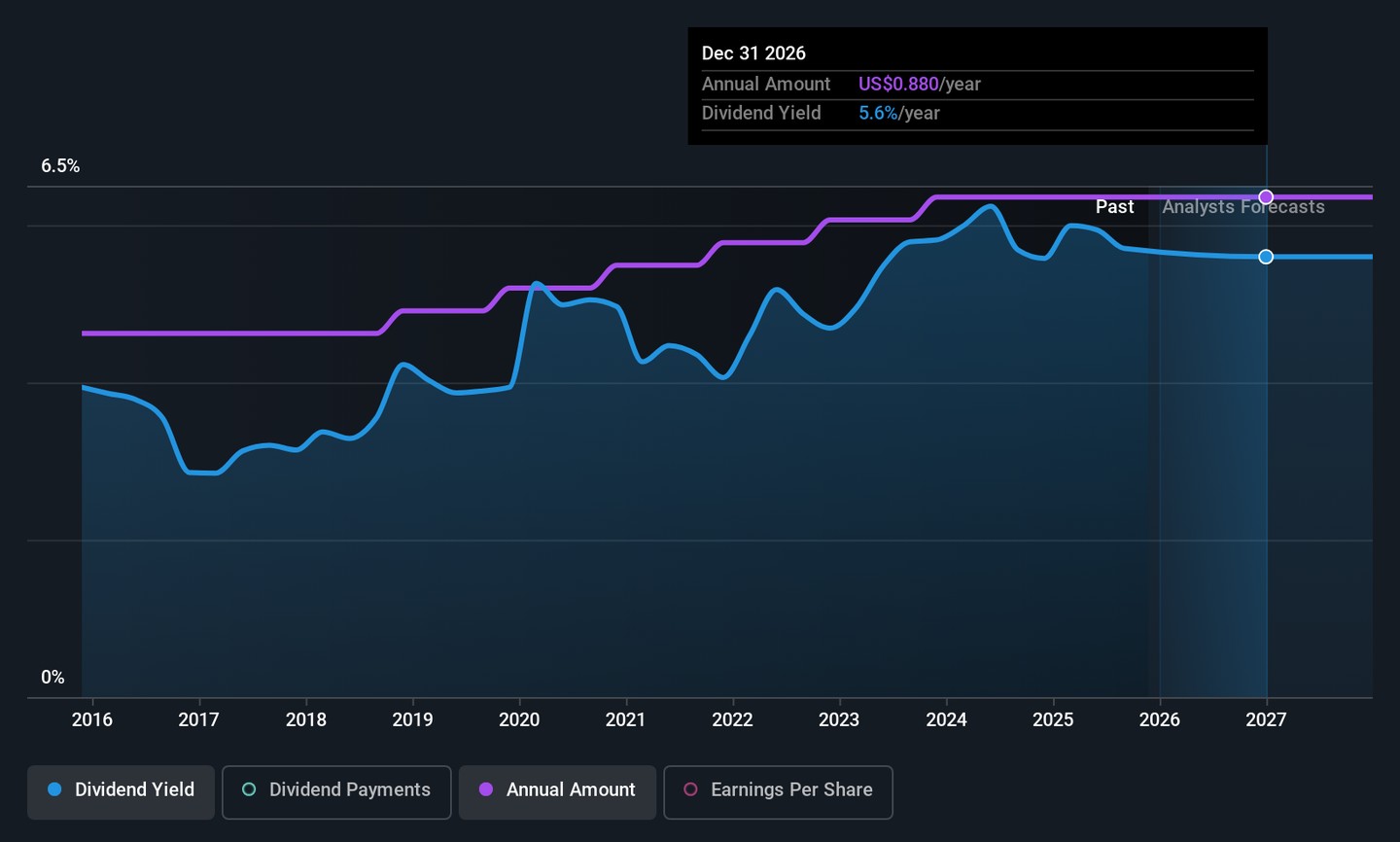 Even over a long history of paying dividends, the company's distributions have been remarkably stable. Since 2015, the dividend has gone from $0.64 total annually to $0.88. This means that it has been growing its distributions at 3.2% per annum over that time. While the consistency in the dividend payments is impressive, we think the relatively slow rate of growth is less attractive.