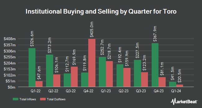 Other institutional investors and hedge funds have also recently made changes to their positions in the company. Brooklyn Investment Group raised its position in shares of Toro by 94.1% in the first quarter. Brooklyn Investment Group now owns 495 shares of the company's stock valued at $36,000 after buying an additional 240 shares in the last quarter. iA Global Asset Management Inc. bought a new position in Toro during the 1st quarter worth $82,000. MTM Investment Management LLC acquired a new position in Toro in the 2nd quarter valued at $85,000. Hoese & Co LLP lifted its position in shares of Toro by 1,481.5% during the 2nd quarter. Hoese & Co LLP now owns 1,708 shares of the company's stock valued at $121,000 after acquiring an additional 1,600 shares during the period. Finally, New Age Alpha Advisors LLC acquired a new stake in shares of Toro during the 1st quarter worth $178,000. Institutional investors and hedge funds own 87.95% of the company's stock.
