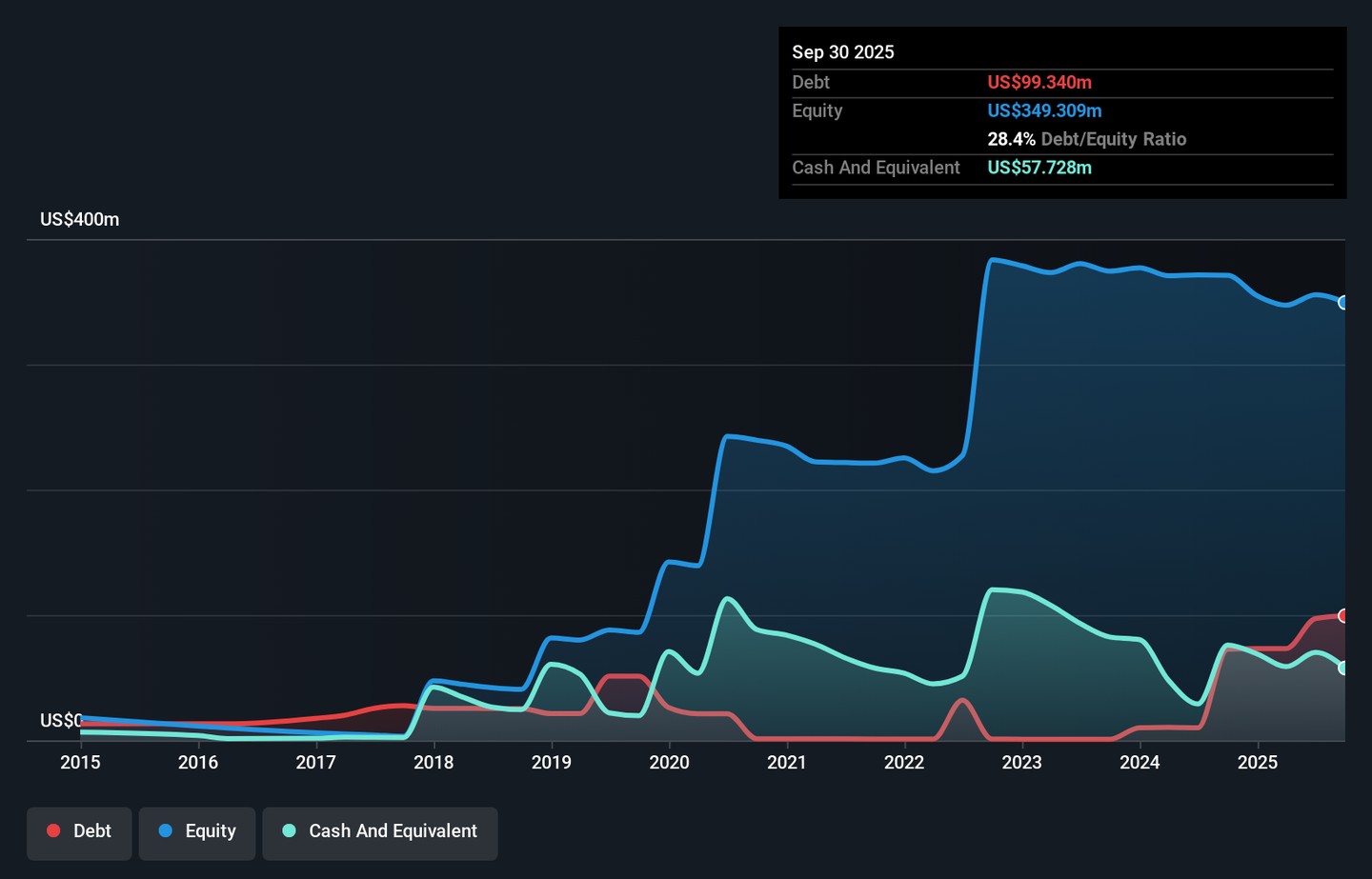 The image below, which you can click on for greater detail, shows that at September 2025 OrthoPediatrics had debt of US$99.3m, up from US$72.7m in one year. However, because it has a cash reserve of US$57.7m, its net debt is less, at about US$41.6m.