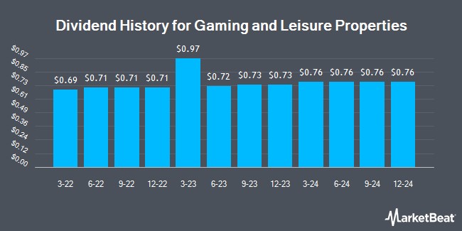 Gaming and Leisure Properties, Inc. (NASDAQ:GLPI - Get Free Report) announced a quarterly dividend on Monday, November 24th. Shareholders of record on Friday, December 5th will be paid a dividend of 0.78 per share by the real estate investment trust on Friday, December 19th. This represents a c) annualized dividend and a yield of 7.3%. The ex-dividend date of this dividend is Friday, December 5th.