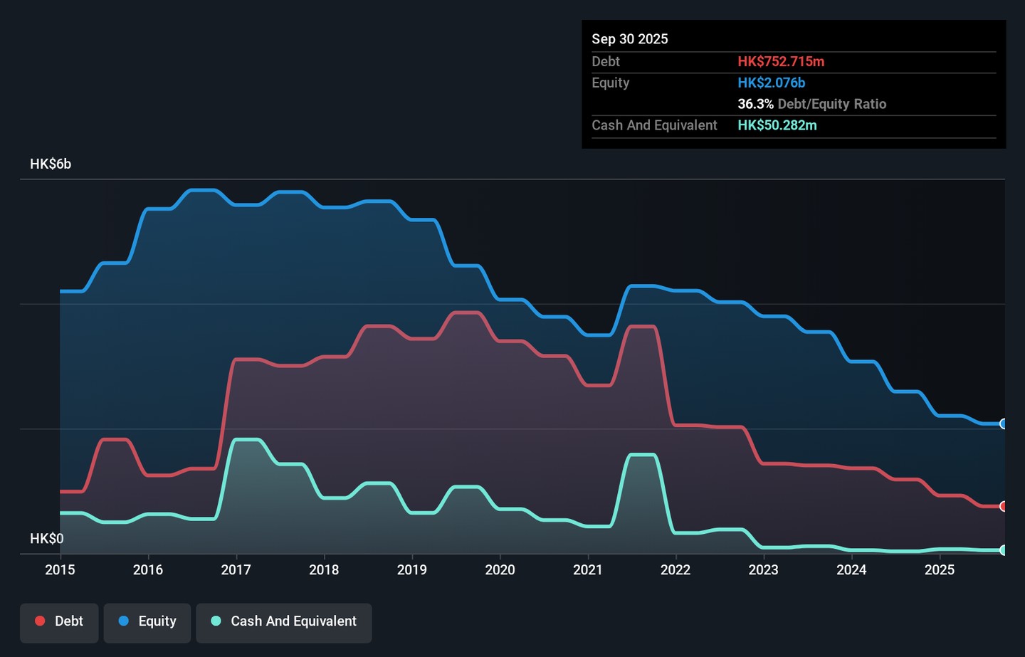 As you can see below, ITC Properties Group had HK$752.7m of debt at September 2025, down from HK$1.18b a year prior. However, it does have HK$50.3m in cash offsetting this, leading to net debt of about HK$702.4m.