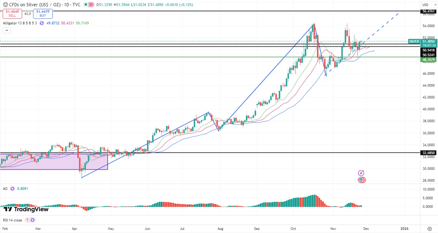 The key to the current trend in precious metals lies in monetary policy expectations and the direction of real interest rates. As expectations for a Fed rate cut soar, silver rose 2.71% on Monday (November 24), holding steady at the $50 mark, while gold increased 1.73%, recovering to $4,100.