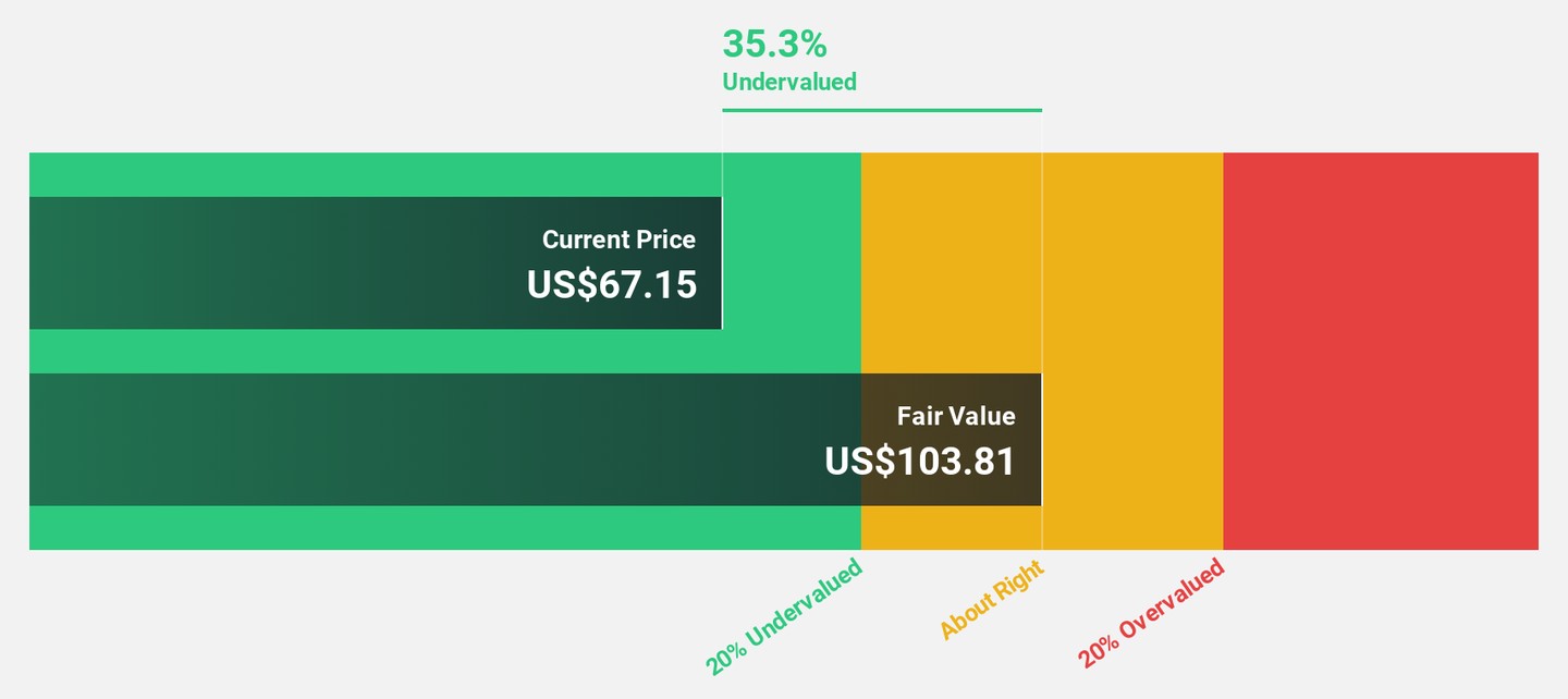 Fidelity National Information Services (FIS), trading at US$65.65, is significantly undervalued with a fair value estimate of US$114.21 based on discounted cash flow analysis. Despite high debt levels and a current net profit margin of 1.7%, FIS's earnings are projected to grow substantially at 49.1% annually over the next three years, outpacing the broader market growth rate of 15.9%. Recent initiatives include enhancing cloud-based solutions and expanding digital finance capabilities, supporting operational efficiency and potential revenue growth opportunities in the financial services sector.
