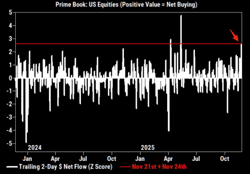 Hedge funds significantly net bought U.S. stocks on both trading days last Friday and Monday, marking the largest two-day net buying volume in over six months and one of the largest net buying volumes in two years