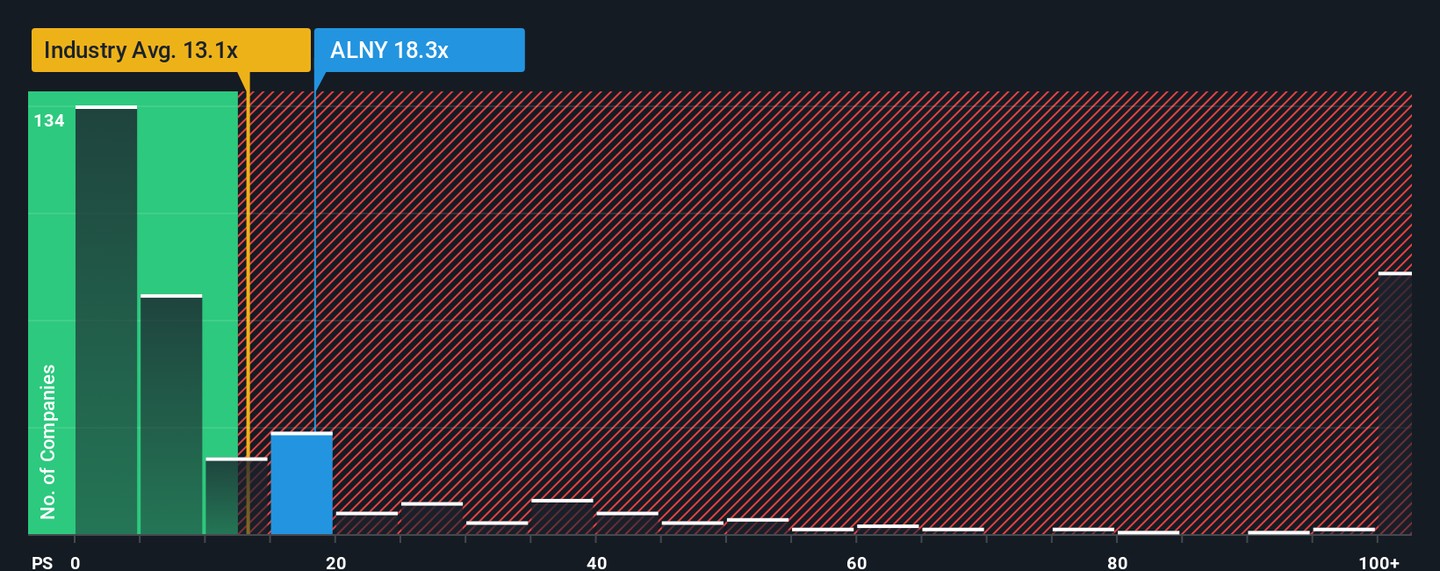 While some estimate Alnylam’s shares to be undervalued, the market’s own price-to-sales ratio tells a different tale. Alnylam trades at 18.3x sales, which is higher than the US Biotechs industry average of 12.3x, above its fair ratio of 15.8x, and greater than the peer average of just 9.5x. This premium means the market is expecting extraordinary growth, so what might happen if these high hopes waver?
